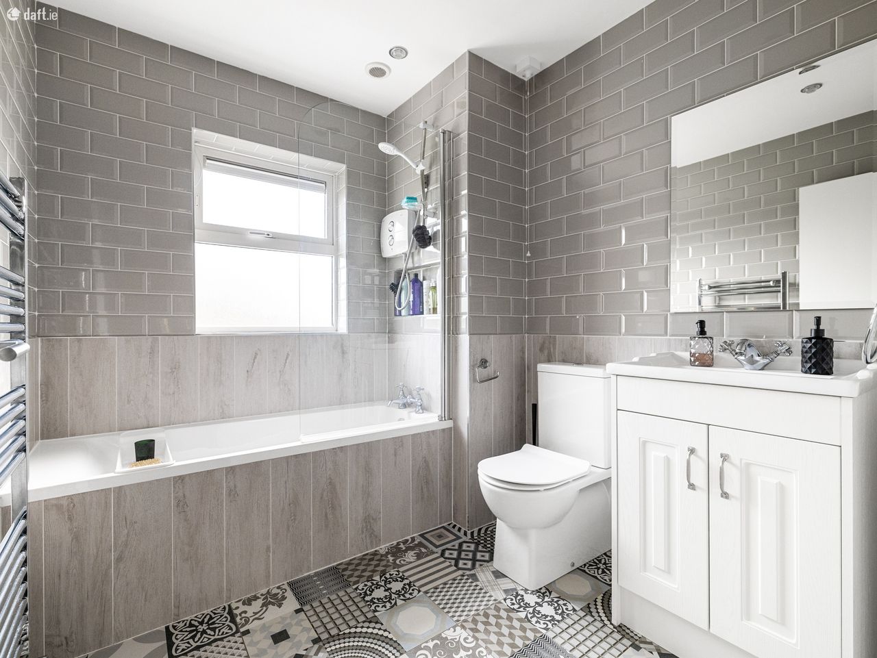 Bathroom: 2.50m x 2.10m DG frosted glass windows to rear aspect, tiled flooring, fully tiled walls, bath with Triton electric shower over and splash-screen, vanity unit with hand basin and W.C.