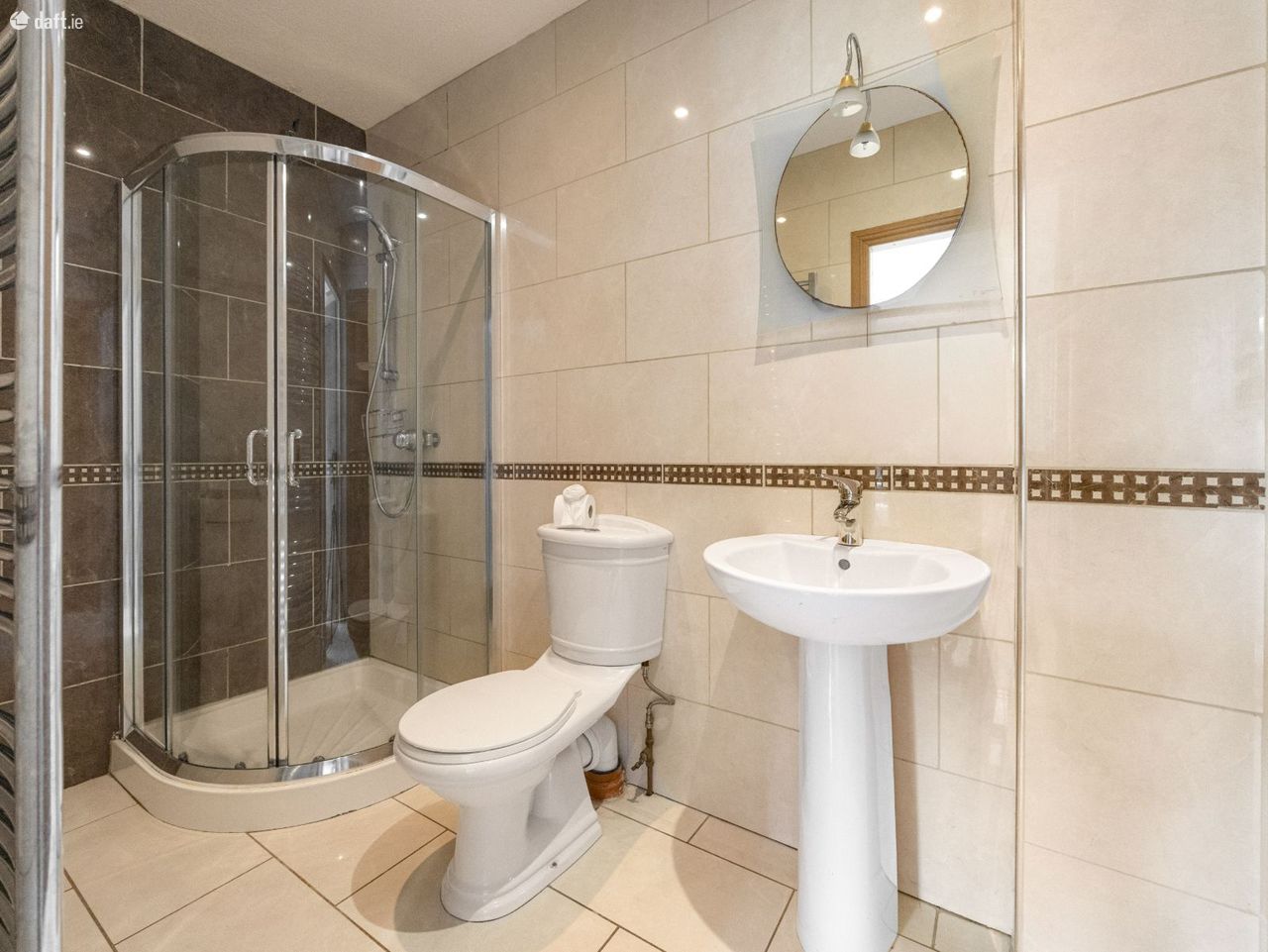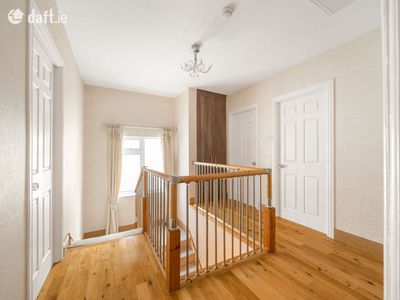 Moving upstairs the chic interiors are continued. An expansive landing boasts quality timber floors which continue through the four remaining bedrooms. The main bedroom is complete with fitted wardrobes and contemporary tiled ensuite shower room with white sanitary suite and stainless steel fittings. Next, youll find three additional bright and spacious bedrooms, each with built in wardrobes. This level also includes the family bathroom, fully tiled and finished with sleek stainless steel fittings and a pristine white sanitary suite.
