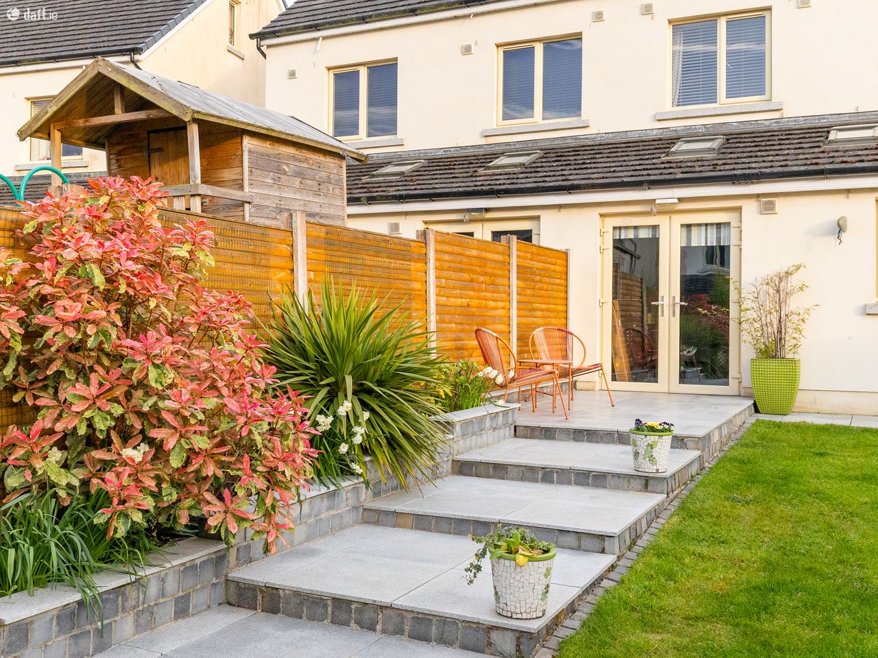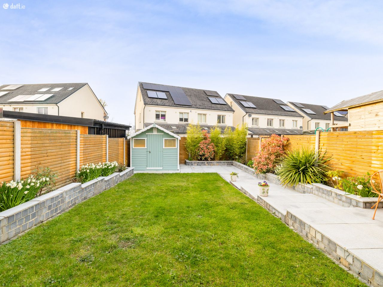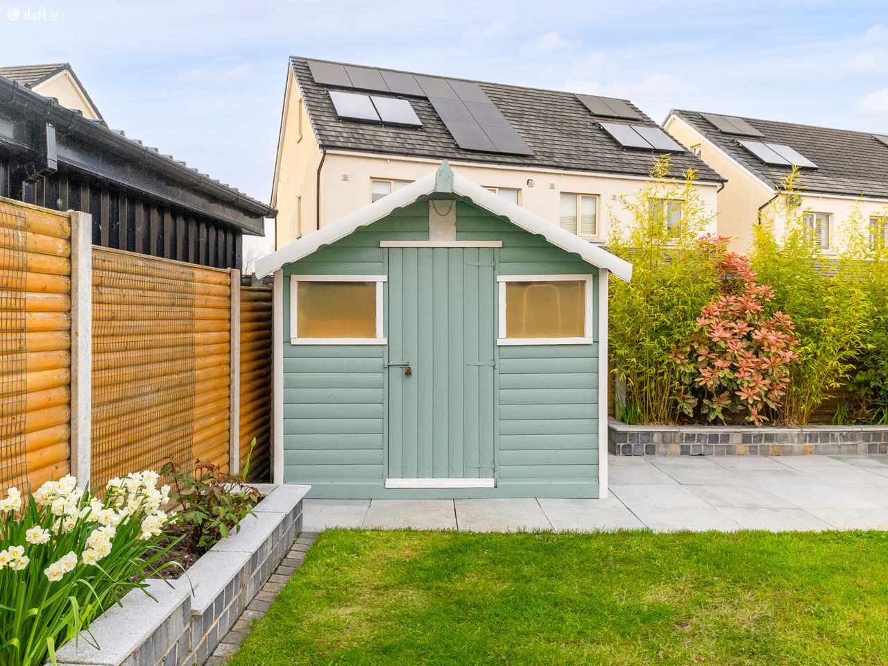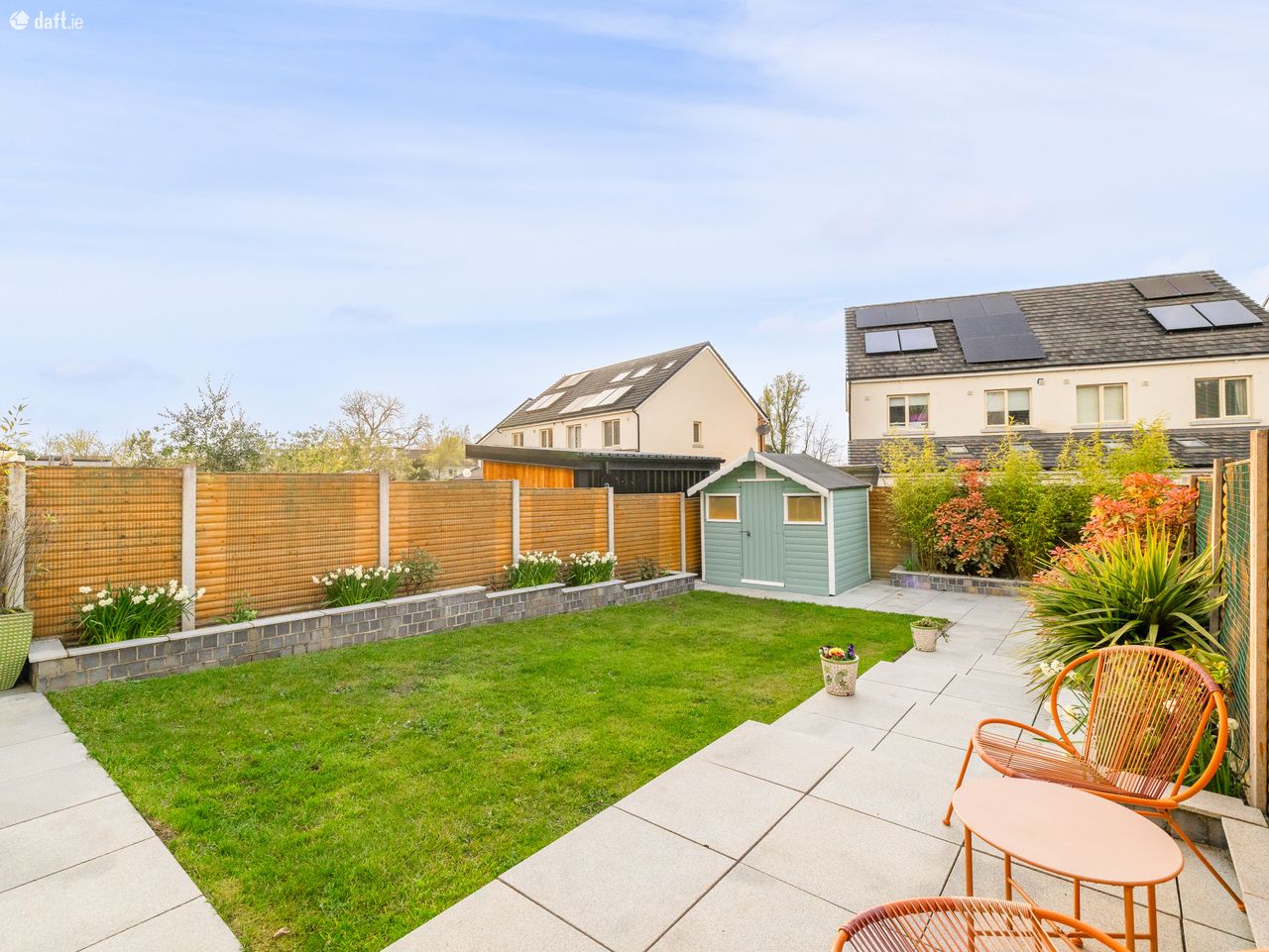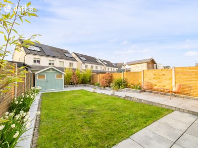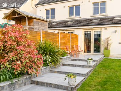 To the rear of the property, a generously sized garden awaits, accessible through double doors from the kitchen or via a secure gated side entrance at the front. This charming outdoor space is laid to lawn and complemented by beautifully planted walled flower beds. The elegant granite patio is perfect for summer entertaining or unwinding. A practical barna shed and colourful mature trees along the rear boundary add both convenience and an extra sense of privacy, completing the picture beautifully.