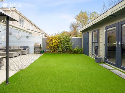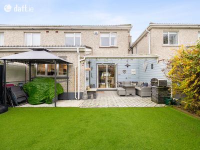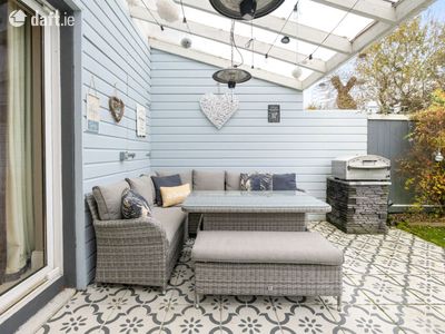 Further complementing the property, off the driveway, a side passage leads to the securely enclosed sunny garden of the coveted west facing aspect. Here, the current owners have created a thorough haven for both young and old! Partially landscaped with lawn, the garden is complemented by a decoratively tiled patio area with overhead cover, providing the perfect spot for outdoor entertaining even in the face of the changeable Irish weather! To the rear, a solid Seomra style structure offers another flexible space for a home office, playroom or any number of family uses!