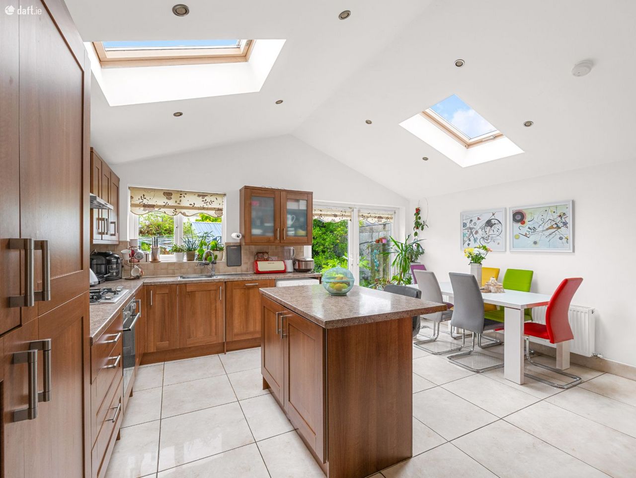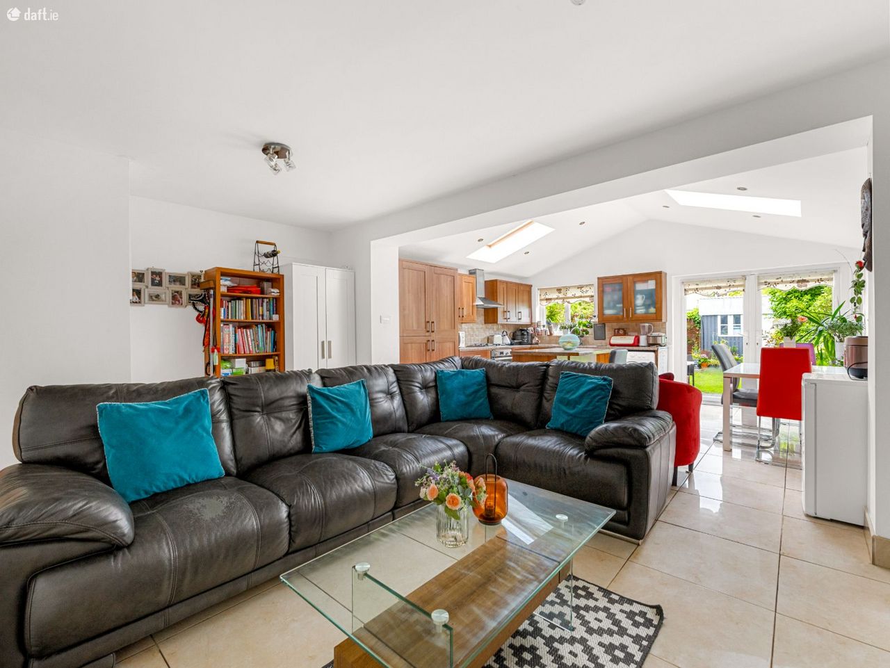 Kitchen/Diner/Chill-out room: 7.60m x 5.50m DG French doors to rear aspect, DG windows to rear aspect, vaulted ceiling with two DG Velux windows to both side aspects, polished Porcelain flooring, a range of eye and base level kitchen units with roll-top work surfaces and tiled splash-backs, integrated oven, hob and extractor, integrated dishwasher, integrated fridge/freezer, space for washing machine and Island unit/breakfast bar.