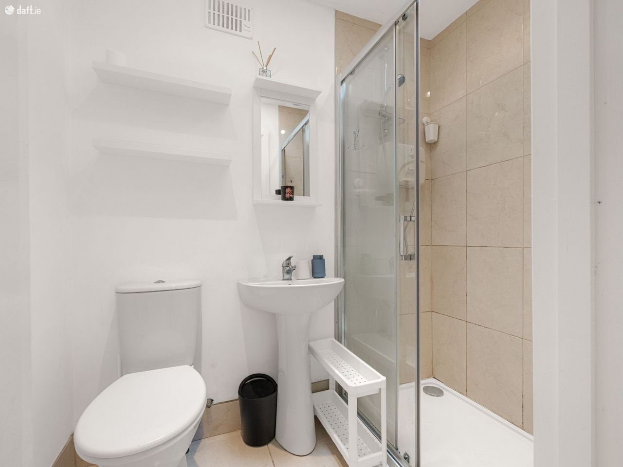 Bathroom: 2.50m x 1.90m DG frosted glass windows to side aspect, tiled floor and walls, bath with shower over and splash-screen, vanity unit with hand basin, W.C. and hot press.