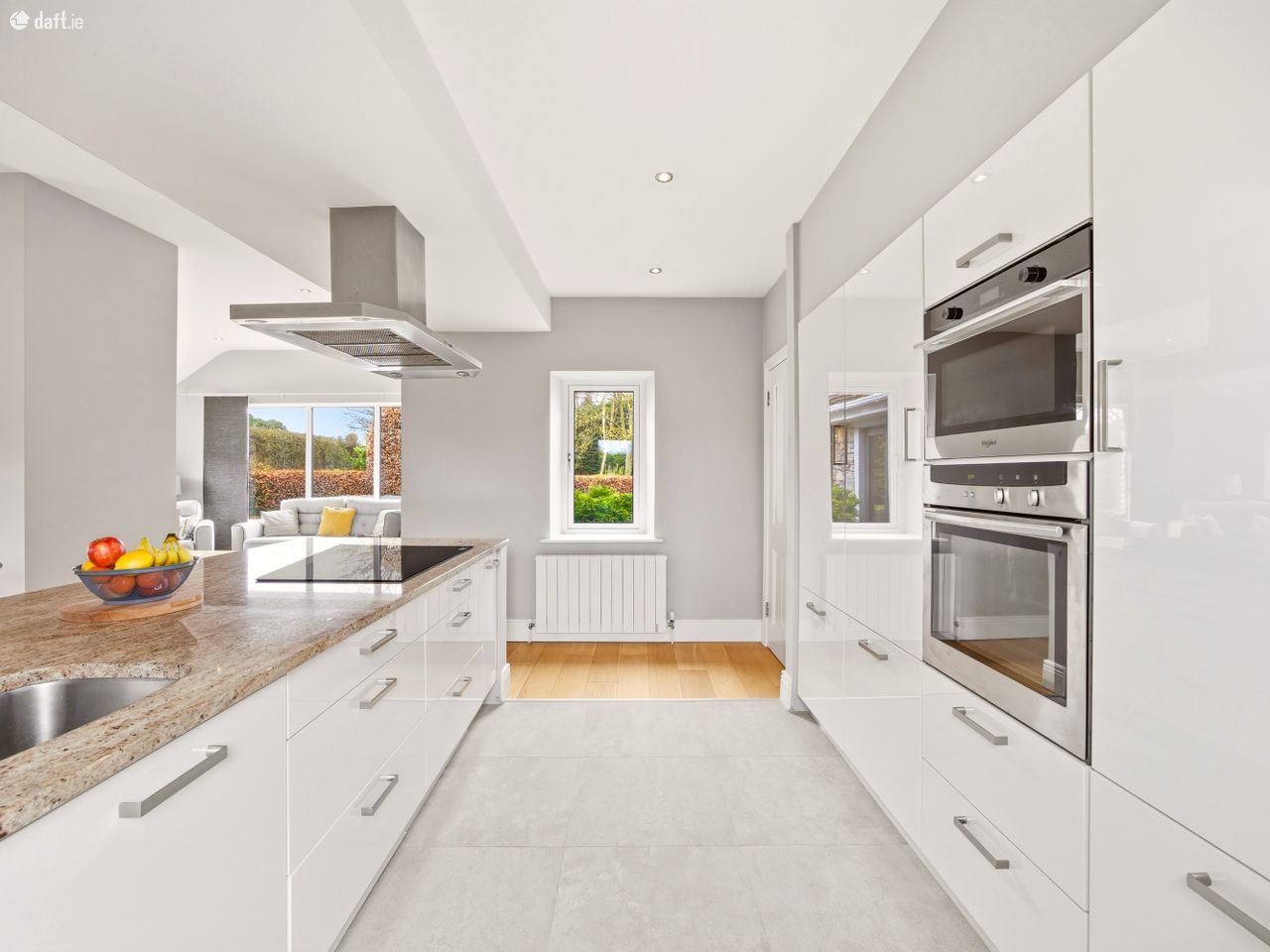 The living accommodation flows back into the hall, where a sleek, modern kitchen opens seamlessly to a dining area and living space. These rooms are subtly defined by a central chimney breast housing a cosy fuel burning stove. The multi aspect windows continue the homes signature theme, drawing an abundance of natural light through, creating a wonderful setting for both relaxed living and effortless entertaining. The kitchen features newly installed units with solid Shiva Granite countertops and integrated appliances and is further enhanced by a generously sized utility room. This practical space is fully fitted with base and eye level units and accommodates an American style fridge freezer alongside the laundry appliances.