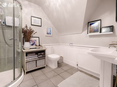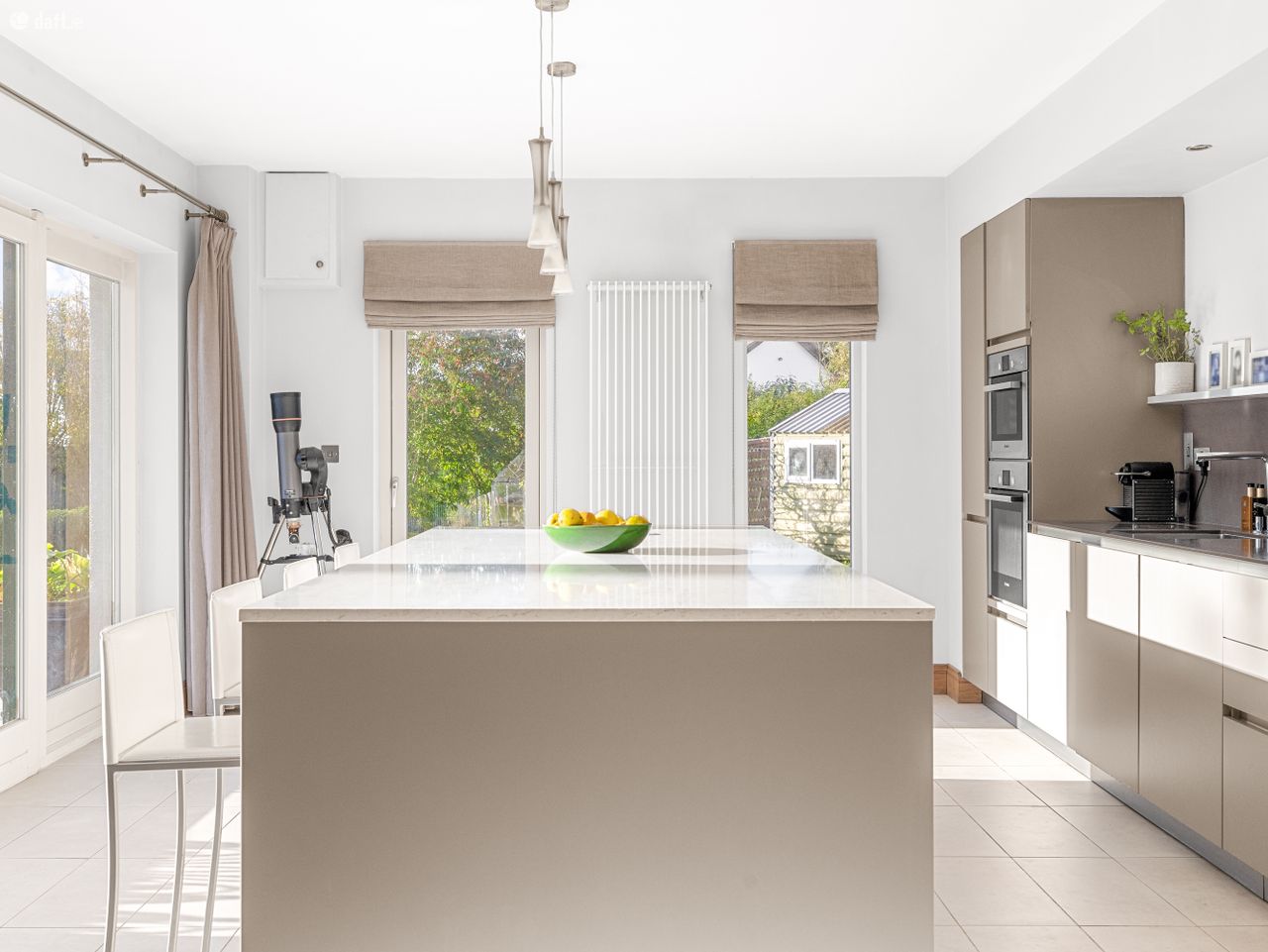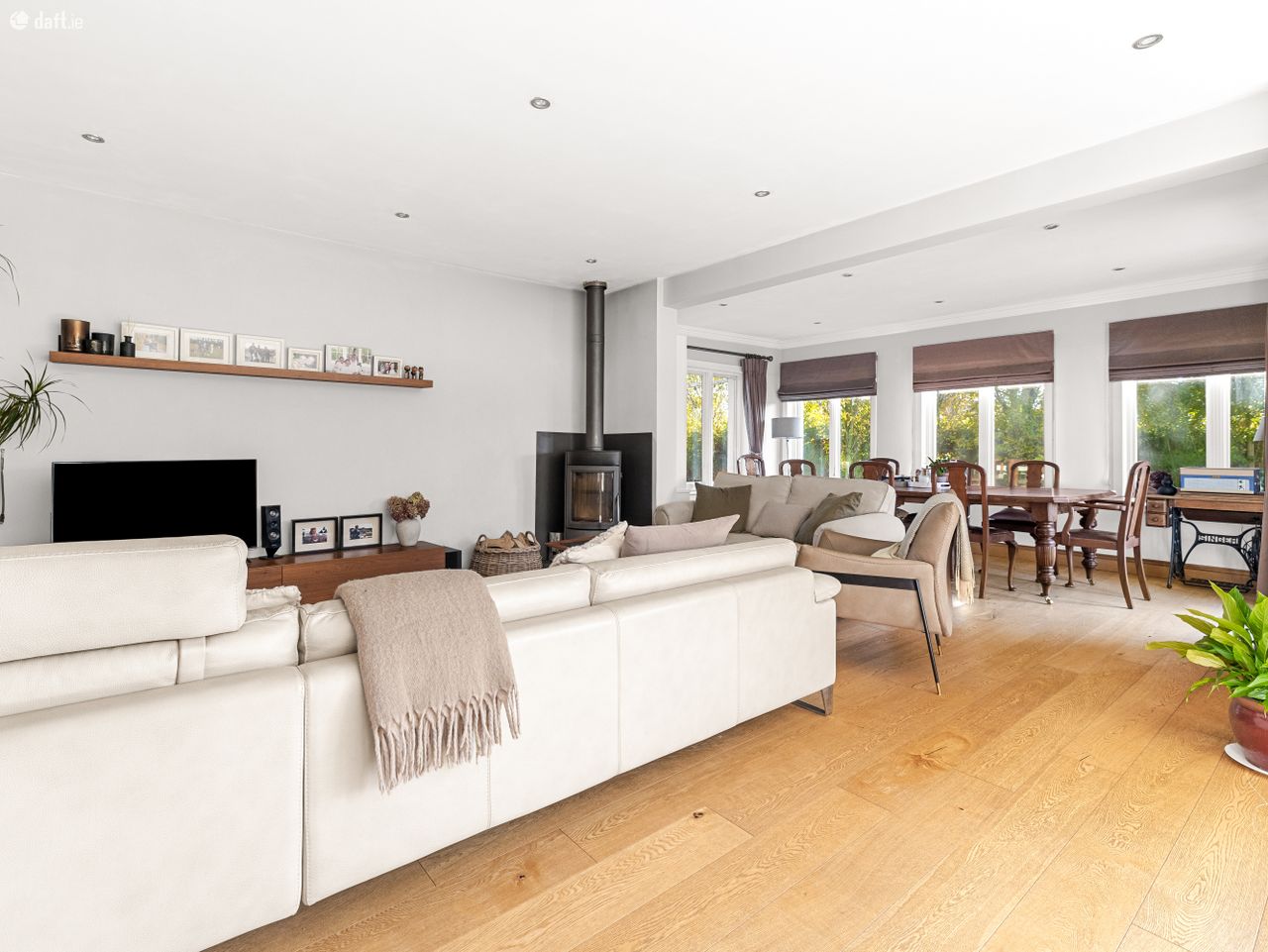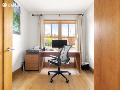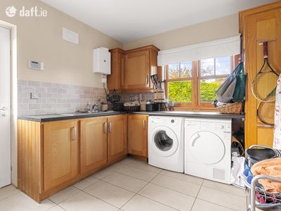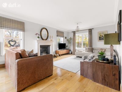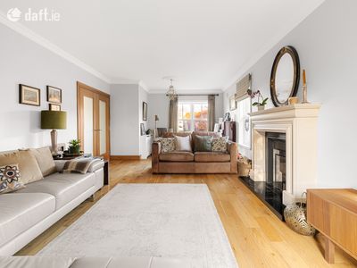 To the left, through double doors, lies a spacious sitting room finished with wooden flooring and decorative coving, and centred around a charming fireplace with built-in stove. Multiple windows allow natural light to flood the room, creating a warm and inviting space ideal for both relaxing and entertaining. At the heart of the home is a beautifully designed open-plan kitchen, dining and living area. The modern kitchen is fitted with stylish cabinetry, quality appliances, generous worktop space and a large central island with seating, perfect for family gatherings and casual dining. The spacious dining area overlooks the rear garden, while the adjoining seating area with cosy stove creates a comfortable space for everyday living. Just off the kitchen is a large utility room with additional storage presses, along with a convenient downstairs WC. A separate office located just off the hallway completes the downstairs accommodation.