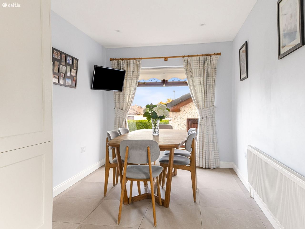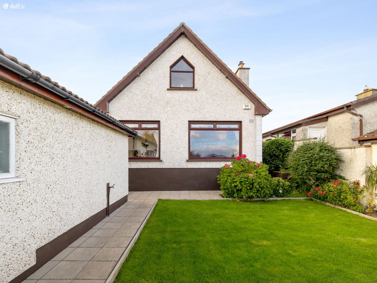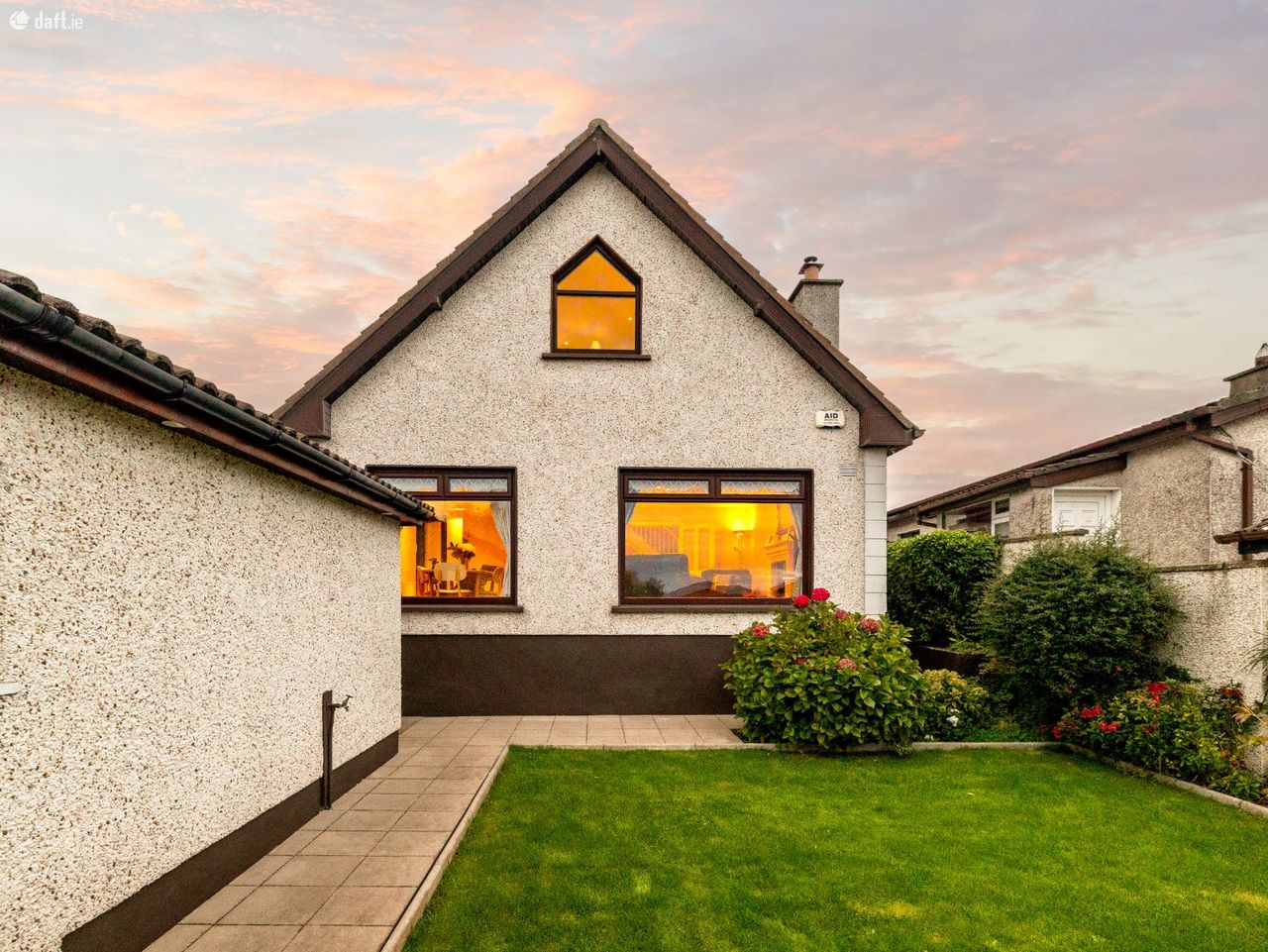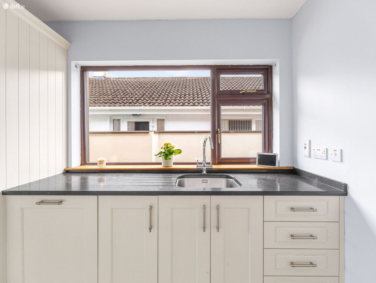 The entrance to this charming home features a red brick archway, leading into a bright and welcoming hallway. To the left, the spacious sitting room boasts wooden flooring, a feature fireplace with stove, and a large picture window that fills the room with natural light. The fully fitted kitchen offers ample storage and countertop space, with a dining area overlooking the rear garden, perfect for family dining.