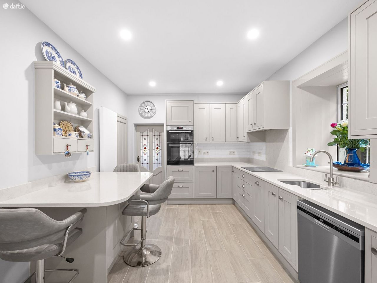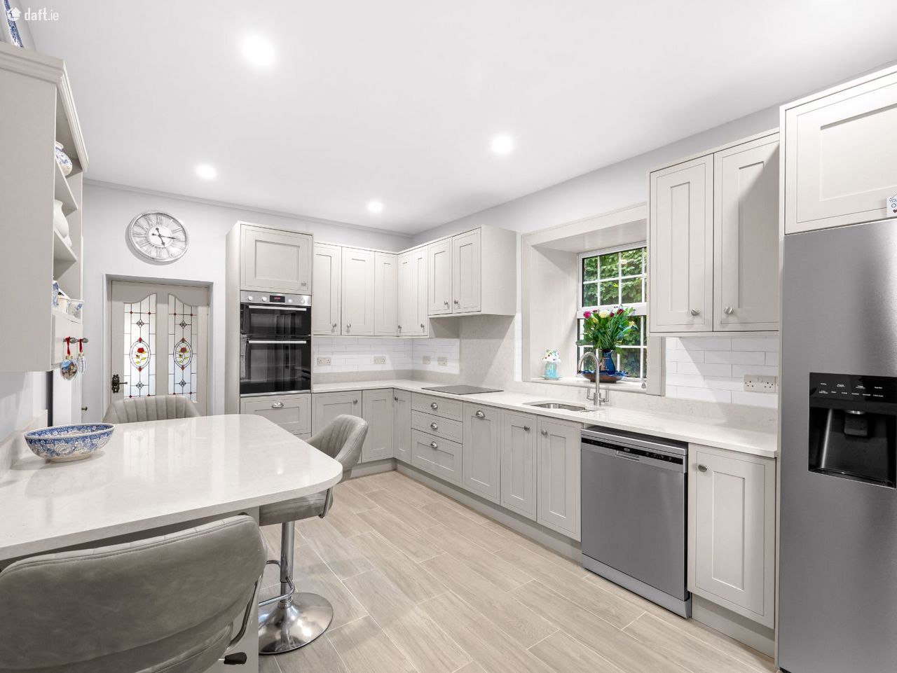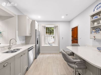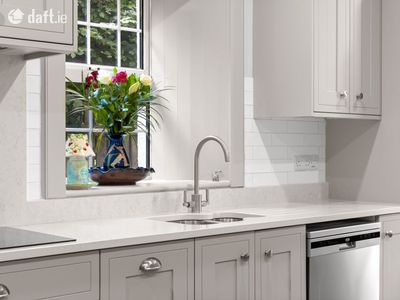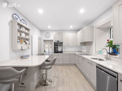 As you step through the front door, you are greeted by a bright, spacious entrance hallway filled with natural light. To the right, the heart of the home awaits. A stylish, modern kitchen designed for both functionality and comfort. This space features abundant high-quality cabinetry, extensive countertop surfaces, and a contemporary breakfast bar for casual dining or morning coffee. Off the kitchen, there is a large utility room with plenty of additional storage and a guest WC, ideal for busy family life.