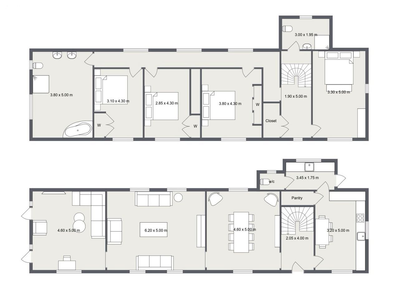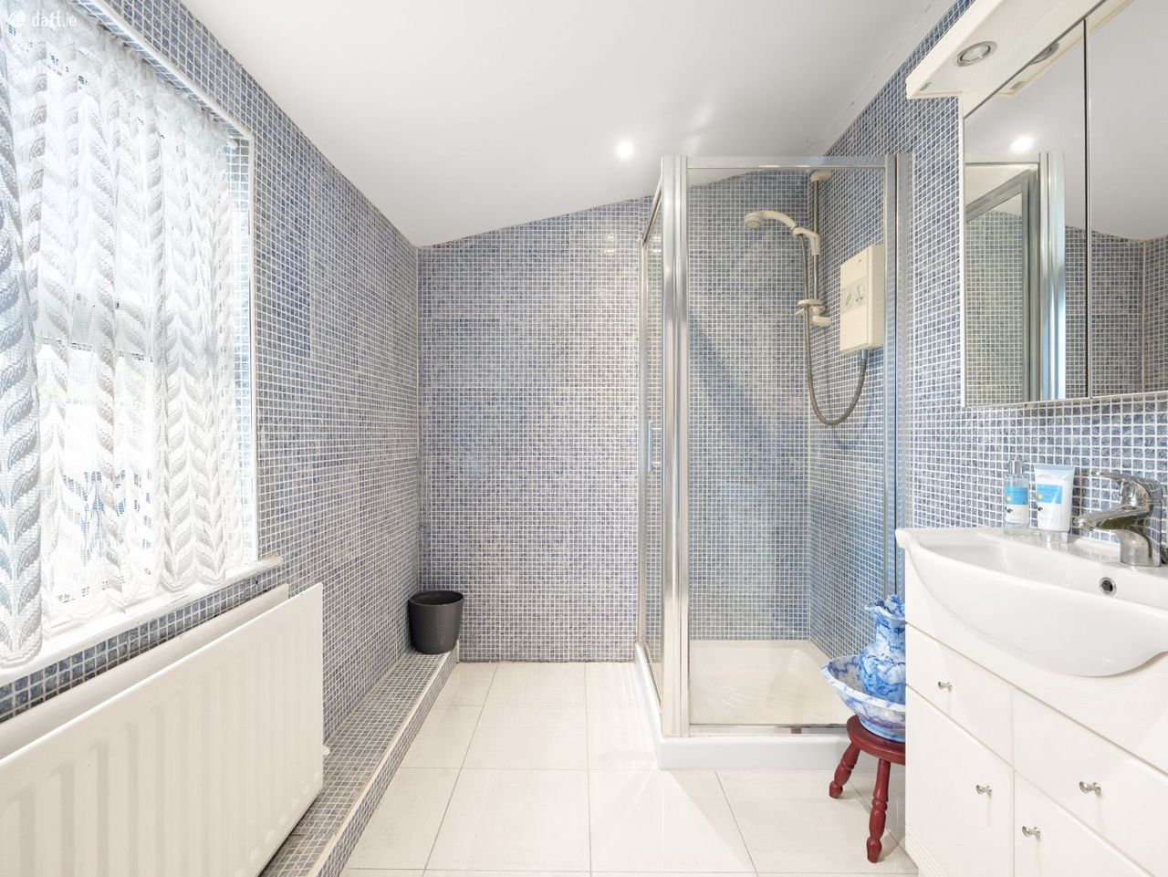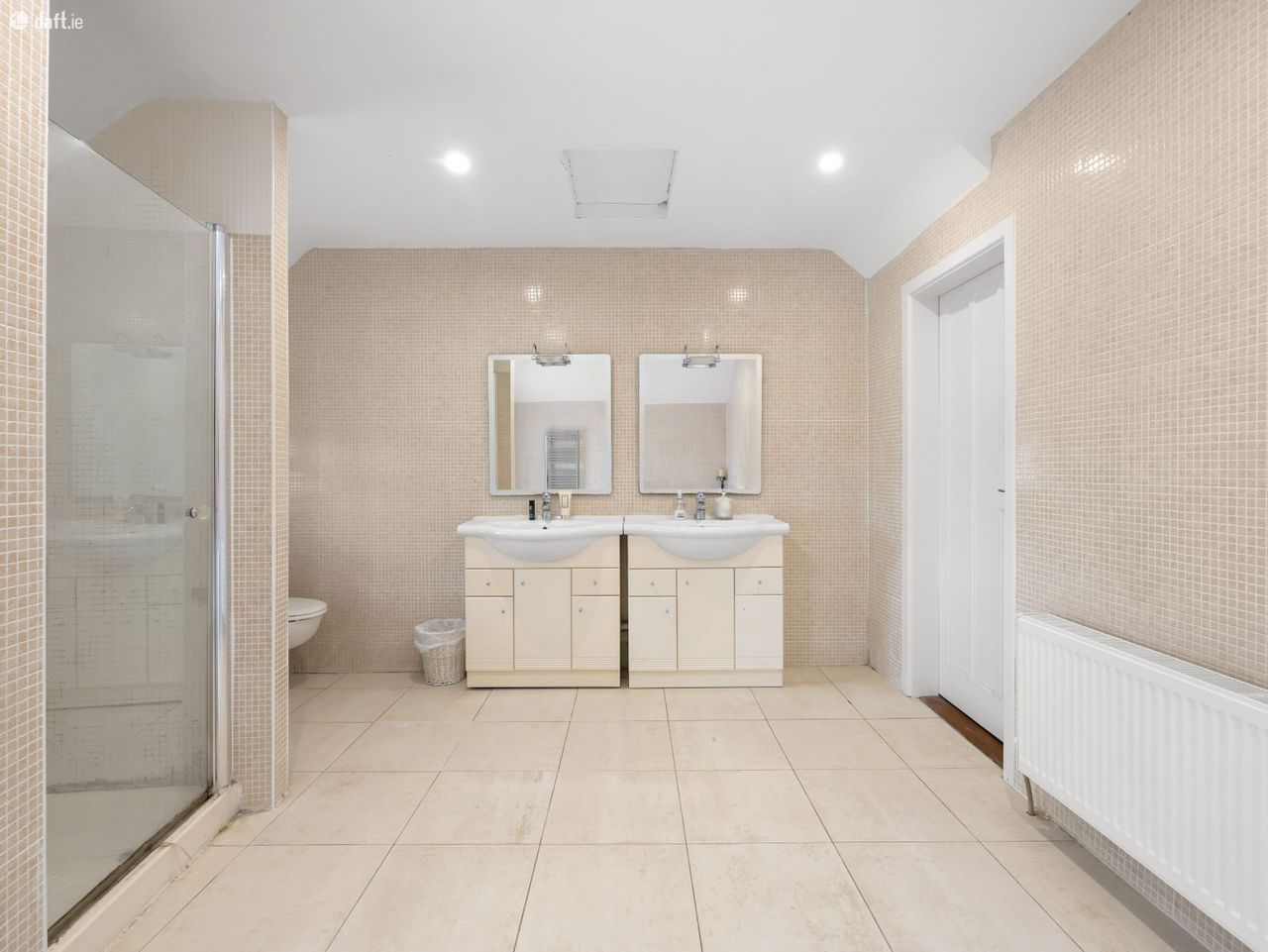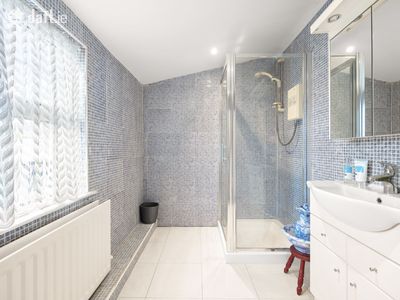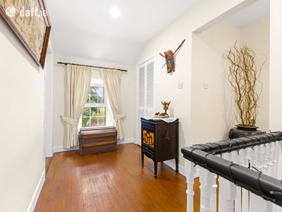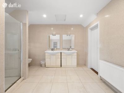 The upper level of the home boasts four generously sized bedrooms and two full bathrooms, all bathed in natural light and finished with wooden flooring. The master bedroom is a peaceful retreat and has great space and dual aspect windows. The main family bathroom is equally impressive, featuring a dual sink vanity and tasteful tiling throughout, ideal for busy mornings and family routines.