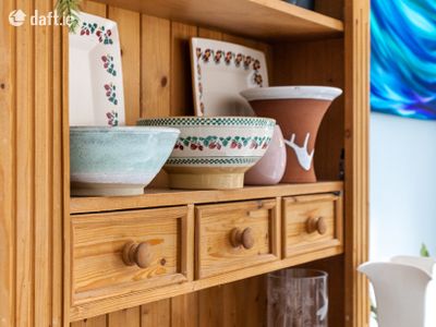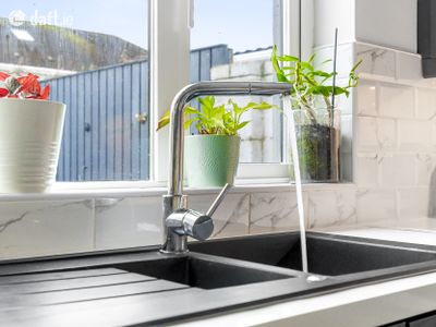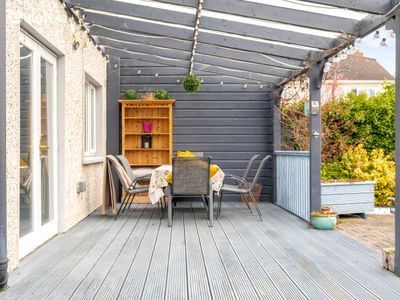 The kitchen is fully fitted and finished with tiled flooring and a breakfast bar, offering both style and practicality. Double doors open onto a covered decking area, creating a seamless indoor - outdoor flow that is perfect for entertaining or relaxing. A generously sized utility room and a guest WC complete the ground floor accommodation.