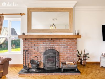 To the left, the principal reception room is a superb light-filled space featuring elegant wooden flooring, a striking red-brick fireplace with open fire, and multiple windows that frame the surrounding landscape and sweeping sea views. Beautifully proportioned, this room is perfectly suited to both relaxed family living and formal entertaining.