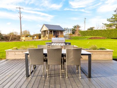 The expansive decked terrace provides an outstanding setting for outdoor dining and entertaining, complete with dedicated seating and BBQ area overlooking the sea. A separate fire pit area offers an atmospheric retreat beneath open skies, framed by the coastal horizon.