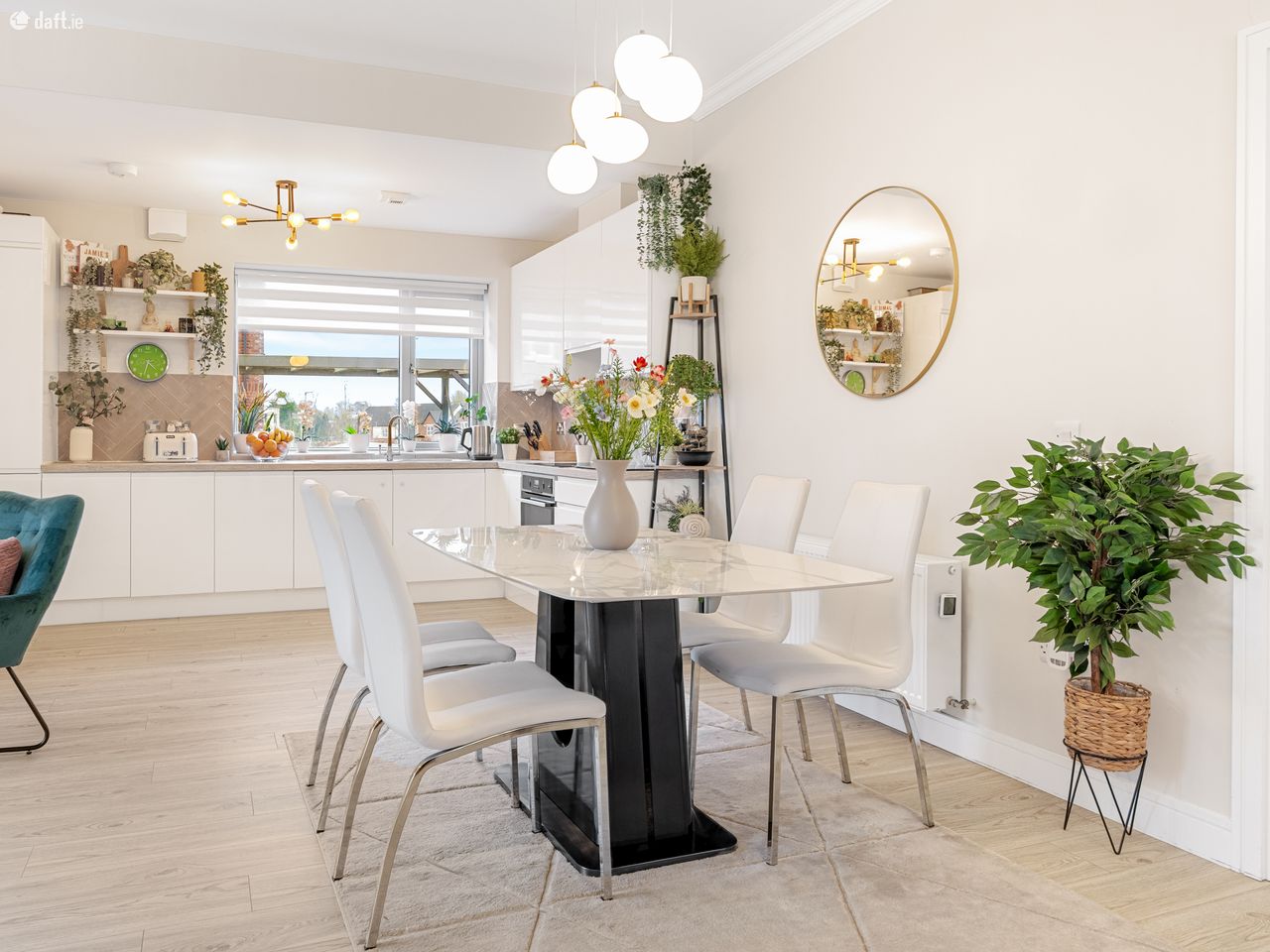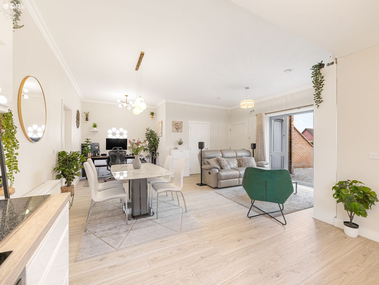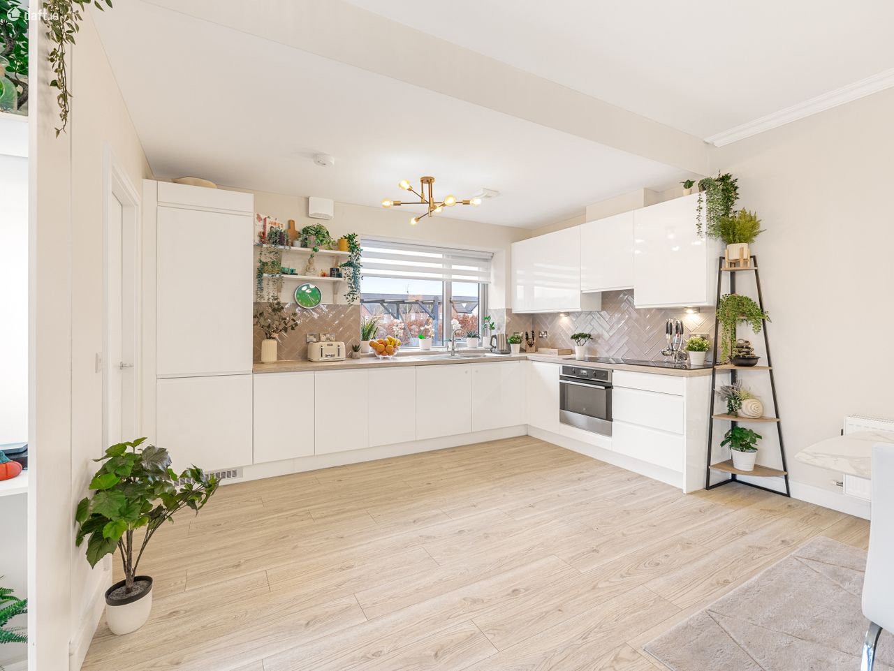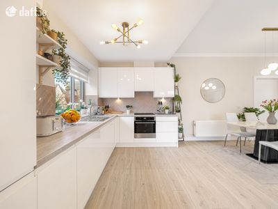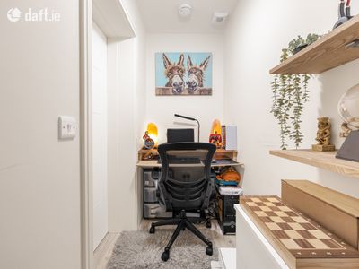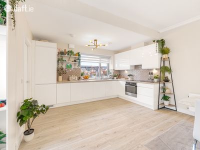 The spacious floorplan comprises 97 sqm approx., of generously proportioned rooms styled to perfection, with wonderfully high ceilings filling each space with natural light. In brief the accommodation consists of: An entrance hall with quality flooring which is continued throughout the property. This opens into a spacious open-plan living, kitchen and dining area offering an ideal setting for both entertaining and unwinding. It easily accommodates a dining table and benefits from a practical utility room along with a storage area so generous it has been adapted into a clever home office!