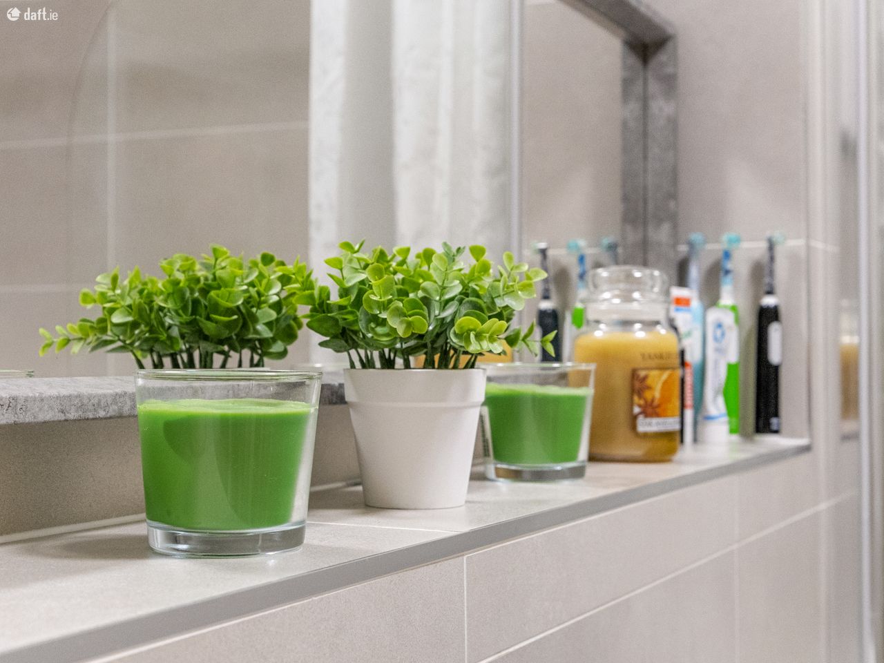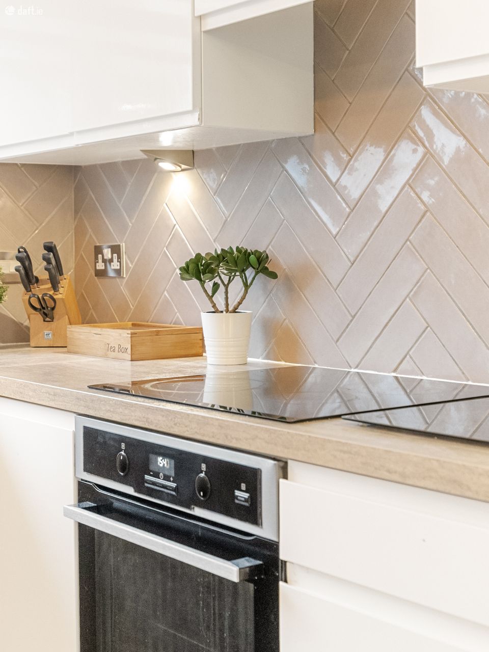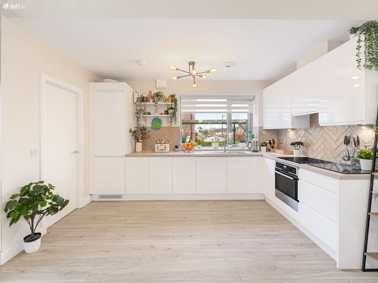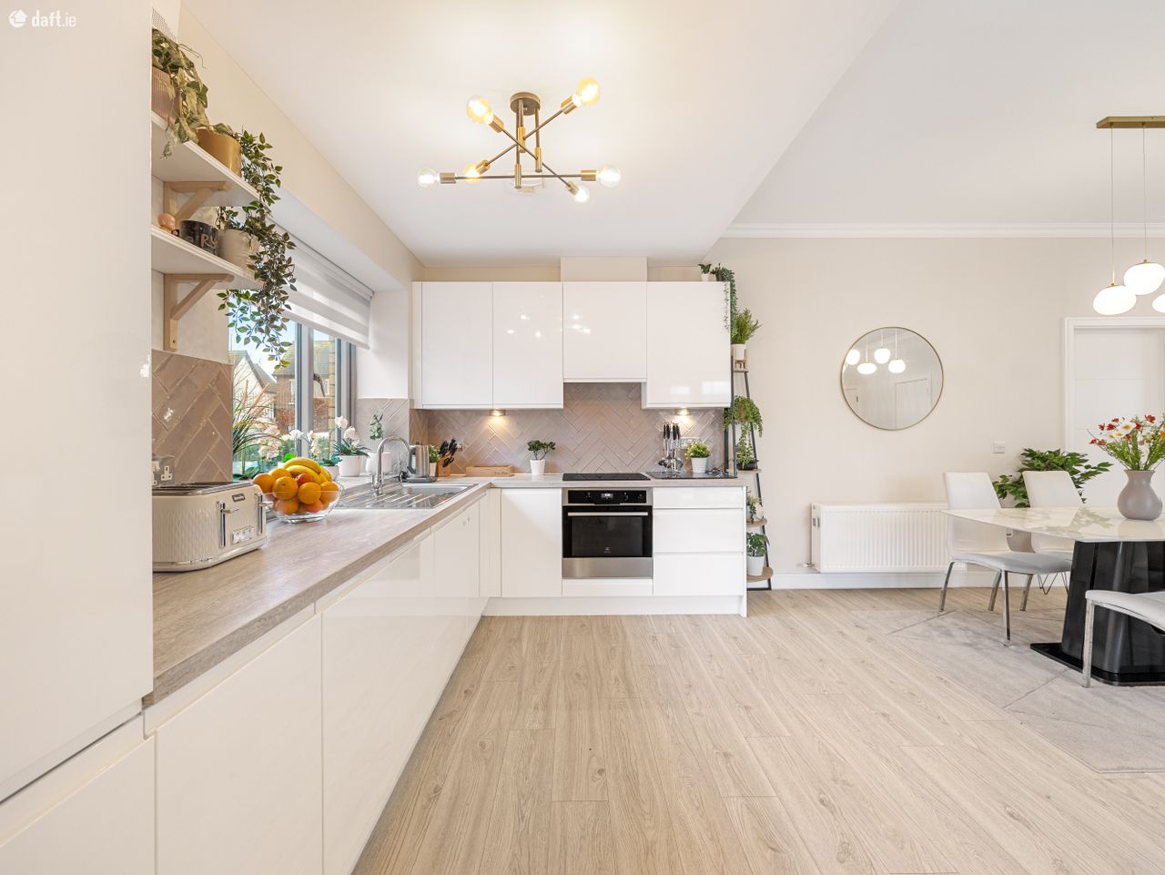 Back to the kitchen where again, quality is the hallmark, with contemporary white units topped with sleek countertops, stainless steel sink and taps all complemented by beautiful herringbone tiled splashbacks. Further enhancing the kitchen space, owing to its end of the block position, the kitchen also benefits from a large window.
