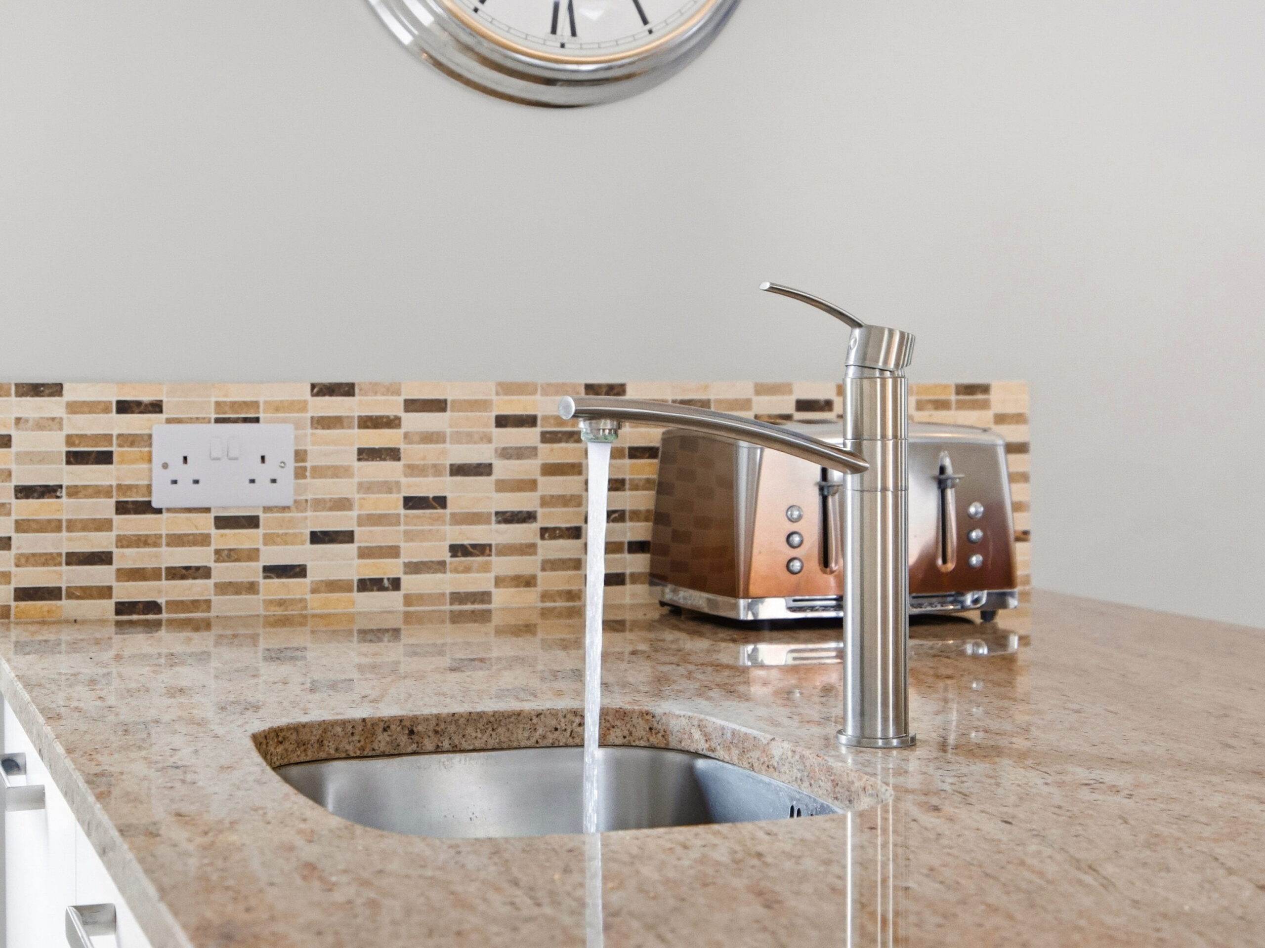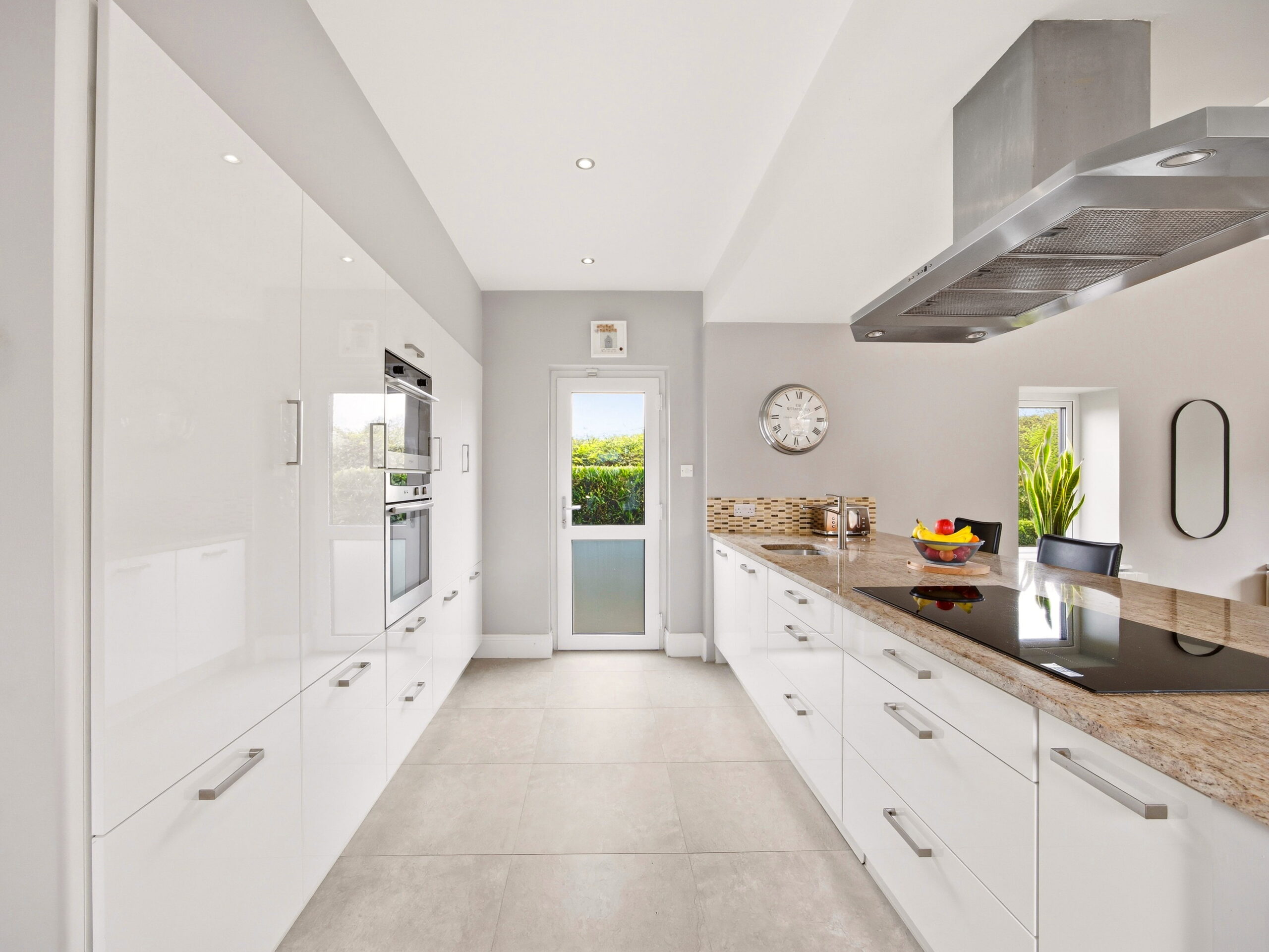 The living accommodation flows back into the hall, where a sleek, modern kitchen opens seamlessly to a dining area and living space. These rooms are subtly defined by a central chimney breast housing a cosy fuel burning stove. The multi aspect windows continue the homes signature theme, drawing an abundance of natural light through, creating a wonderful setting for both relaxed family living and effortless entertaining. The kitchen features newly installed units with solid Shiva Granite countertops and integrated appliances and is further enhanced by a generously sized utility room. This practical space is fully fitted with base and eye level units and accommodates an American style fridge freezer alongside the laundry appliances.