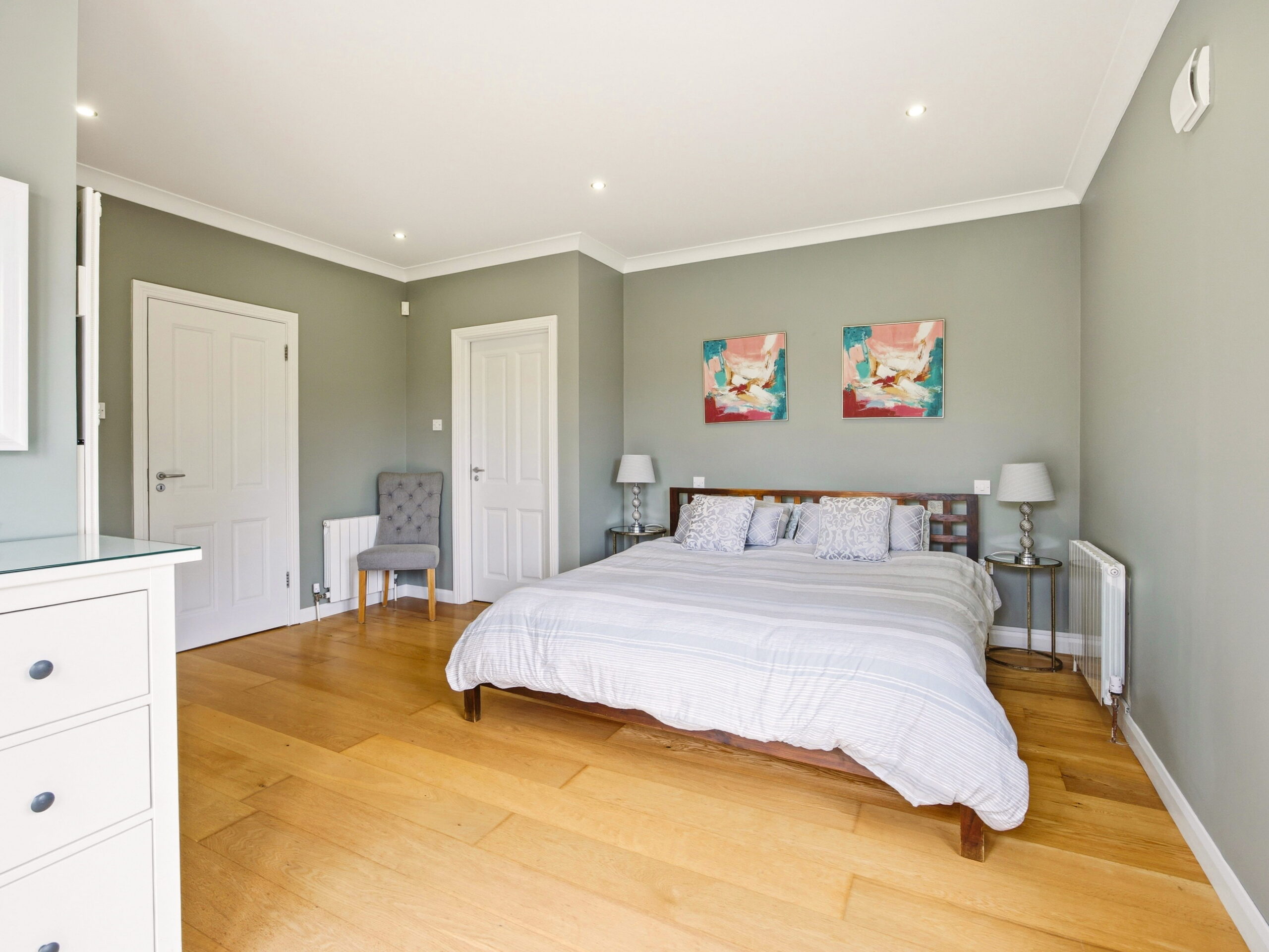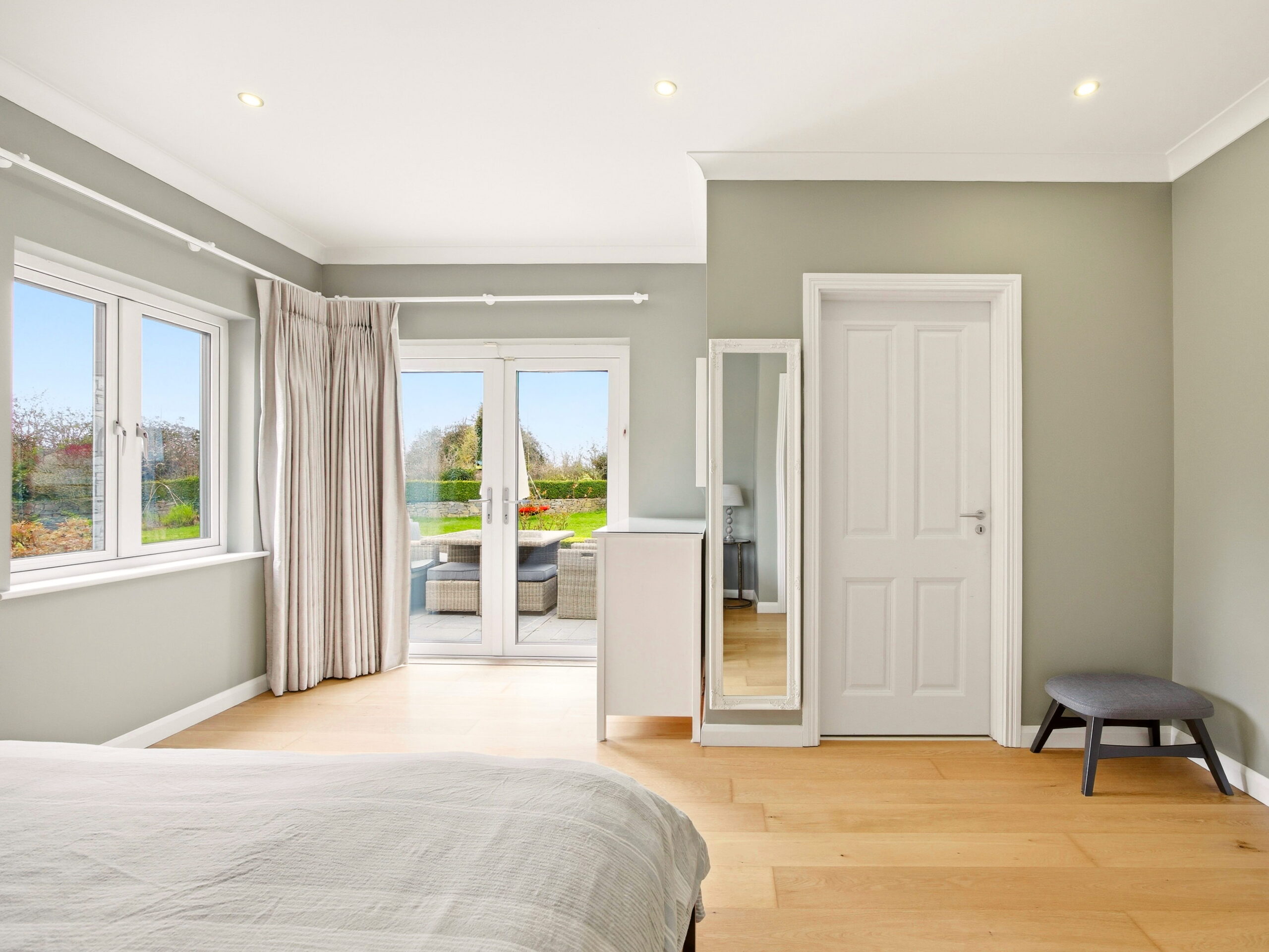 Moving across the hall along the solid oak floors you will find the bedroom accommodation. The principal bedroom suite comprises a beautifully appointed double bedroom with patio doors opening directly onto the garden. It is further enhanced by a superbly finished, fully tiled en suite complete with a walk in shower. Completing the space, is a walk in wardrobe with full height hanging and bespoke storage, creating an exquisite dressing space. Moving on to the main bathroom, you are greeted by another generously proportioned space, finished in Travertine tiling and fitted with pristine white sanitary ware. The room features both a deep-set bath and a separate shower. The remaining two downstairs bedrooms are both double size with extensive fitted wardrobe space with lovely outlook onto the rear of the property.